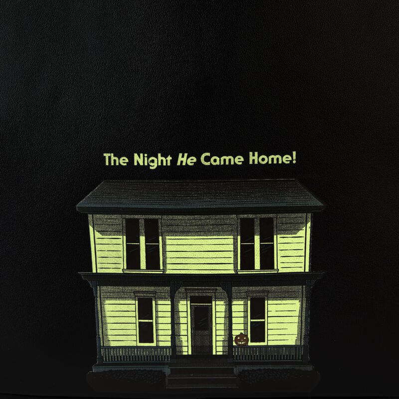 Cue the haunting theme song and look sharp! Make an entrance with our Loungefly Michael Myers Halloween Cosplay Mini Backpack. Michael Myers’ eerie, masked face comes to life in applique detail, rising up over the top edge of the backpack. In the dark, the entire face glows! The front zipped pocket features applique shirt pockets and a collar. A metal zipper charm, in the shape of a knife, is a pointed nod to the legacy of this slasher film. On the back, you’ll find the famous house setting for this classic Halloween movie, along with the words, “The Night He Came Home”—and they glow in the dark! Pack just what you need to enjoy a night of fun watching scary movies at friends’ houses—or simply visit your favorite haunts in style.