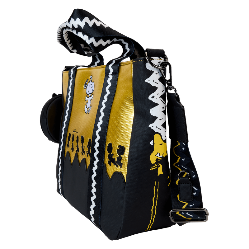 Happiness is…a big celebratory feeling you can take with you wherever you go. Celebrate the 75th anniversary of Peanuts™ with our tote bag featuring the whole gang. Charlie Brown’s signature wavy stripe makes several fun appearances on this bag, starting with the die-cut waves on the bottom front. Above, the whole gang appears as embroidery, in silhouette form, against a textured, shiny yellow background. Snoopy is above, doing a happy dance. A coin purse marking the 75th anniversary gives Snoopy an opportunity to make an encore appearance, snoozing on top. Flip the bag around, and you’ll find the words “Est. 1950,” to recognize 75 years of Peanuts characters. Pack your daily essentials in this roomy tote to commemorate a milestone anniversary and add a little character of your own.